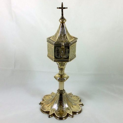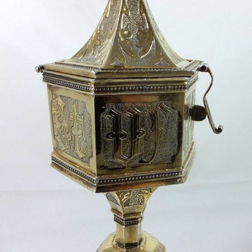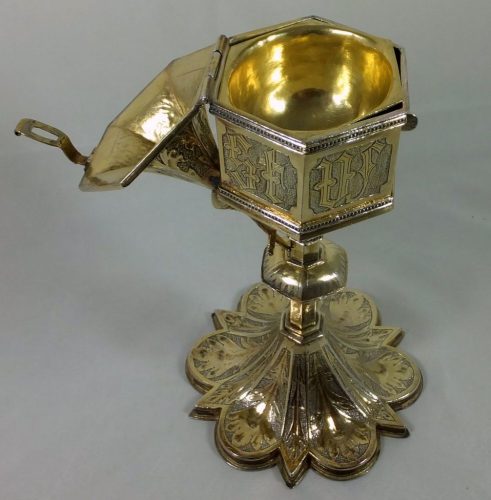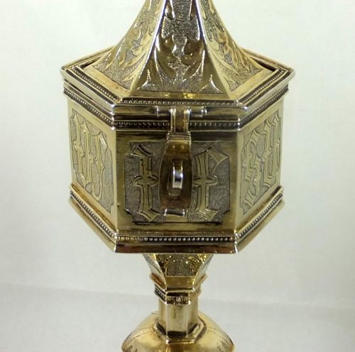 Late gothic Spanish silver gilt pyx ca 1480-1500.The hexagonal top is flat-chased with the word “Jesus Christ”