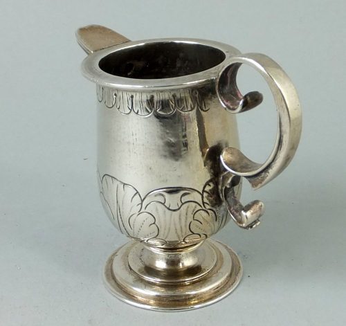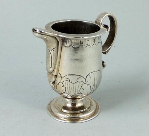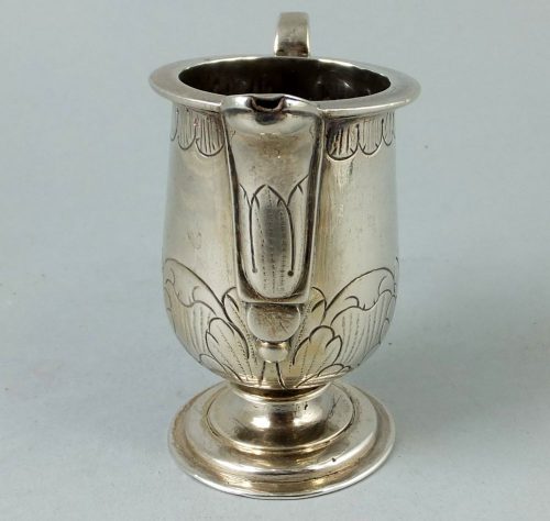 Ca 1600 small embossed and flat chased silver jug. Cast handle and spout. Probably Peru.
