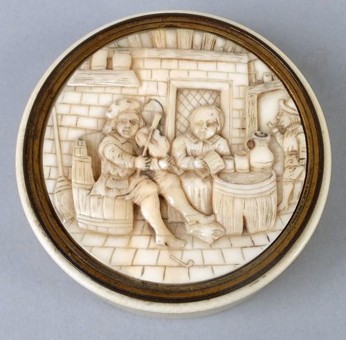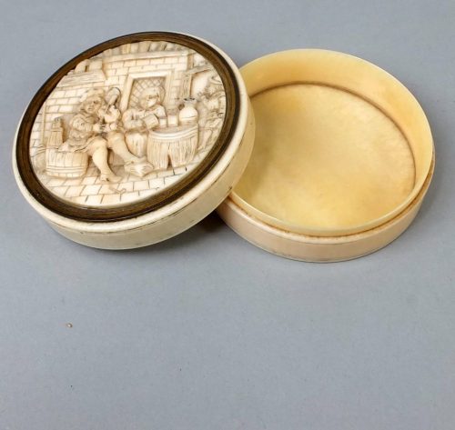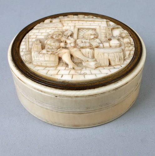Circular ivory snuff box with a finely carved lid. Probably German ca 1670-80.