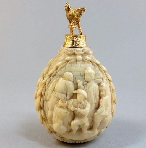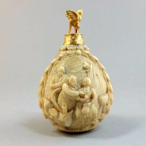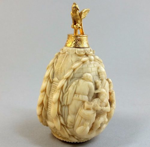 Carved marine ivory / walrus / snuff bottle. Probably English ca 1730. The two sides are carved with drinking scenes.