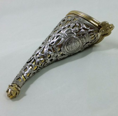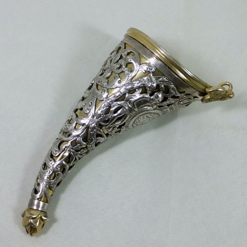 Unmarked probably German silver “cage work” silver cup, dated 1749 in a cartouche with a conjoined monogram