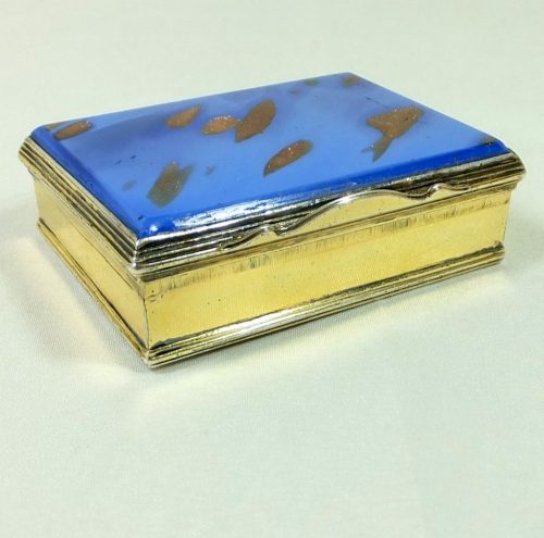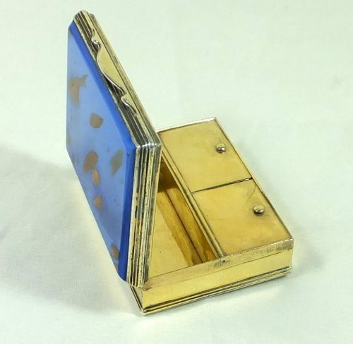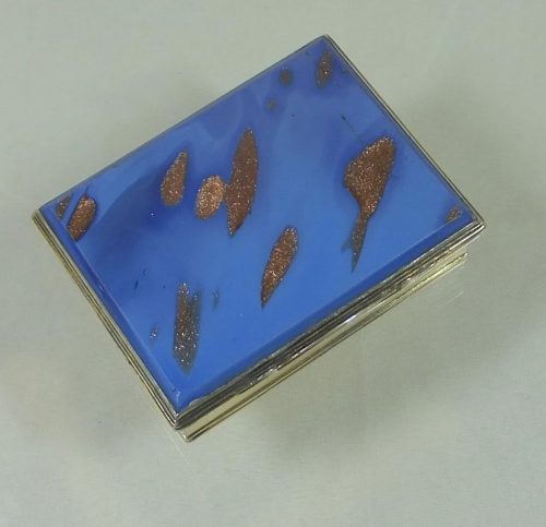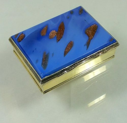 1750-60 silver box with two iside compartments and original mirror inside lid. The top is Venetian goldstone glass. In wonderful original condition and with the original fire gilding inside.