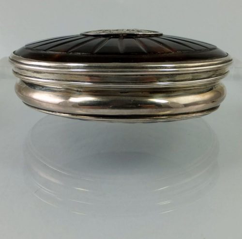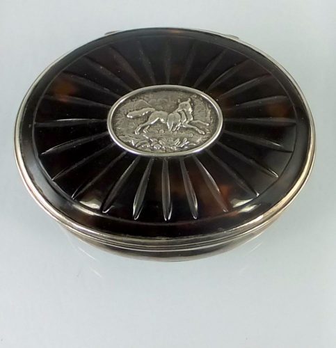 ca 1780 silver tobacco box in silver and tortoise shell. The lid is inset with a silver plaque of a running fox.