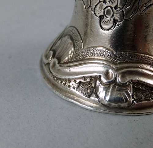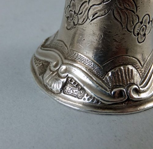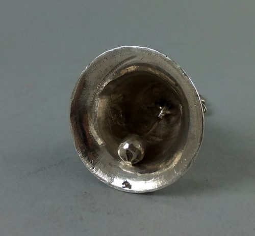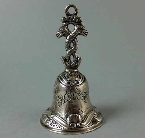 Silver table bell hallmarked with the town mark of Madrid for 1776 and a Makers mark. Cast and flat chased .