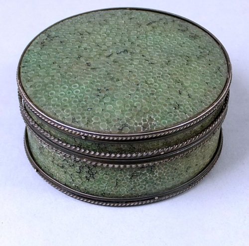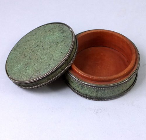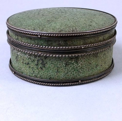 Ca 1880 Arts and Crafts wooden box , covered in green shagreen and with silver mounts