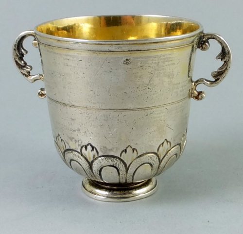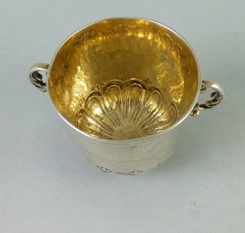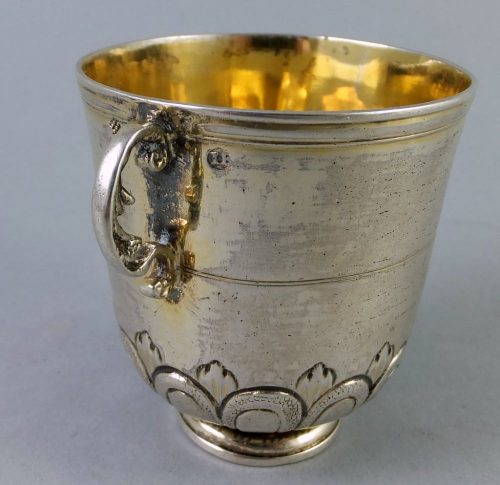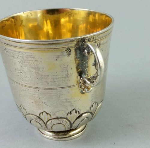 Small Augsburg drinking cup on a small spread foot and with two cast handles on either side. With assay scrape underneath and the Augsburg town mark and makers mark on side of one of the handles.