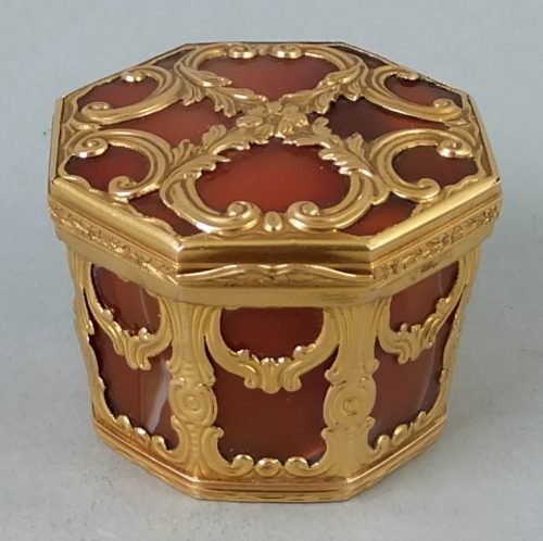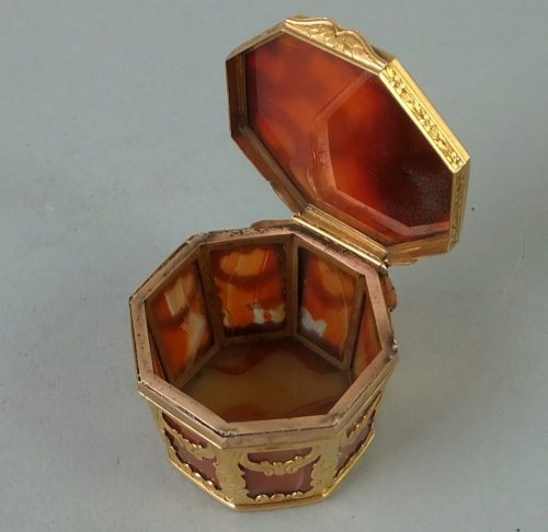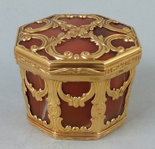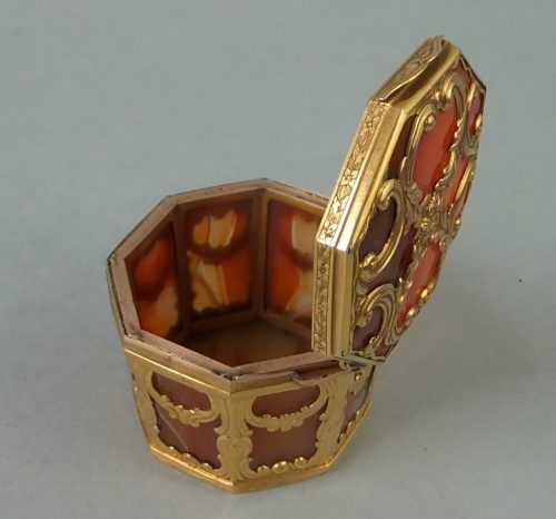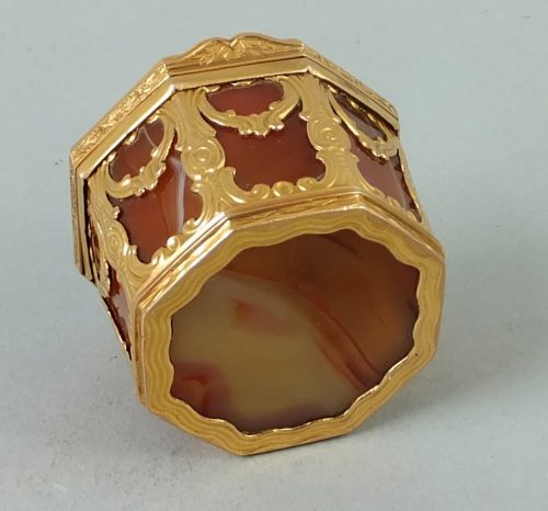 Unmarked Ca 1760 probably English eight sided gold mounted agate snuff box. The agate panels are held in place py a “cage” work gold trelice which is pinned together.