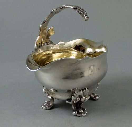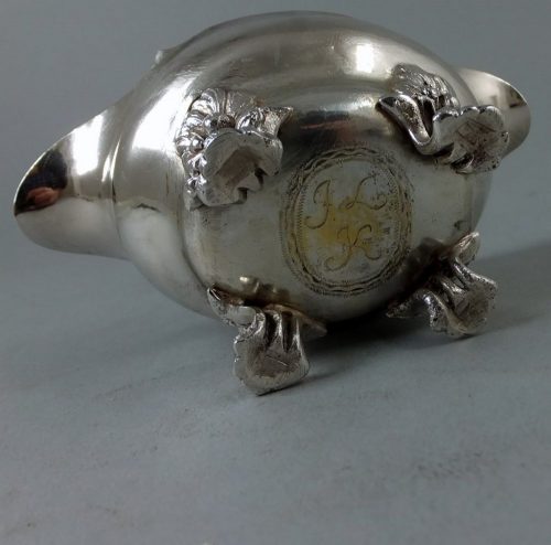 Unmarked probably Swedish or Norwegian 1770 silver cream boat on four cast and chased feet, with a similar cast overarching flowergarland handle. The underside is engraved with initials in a cartouche.