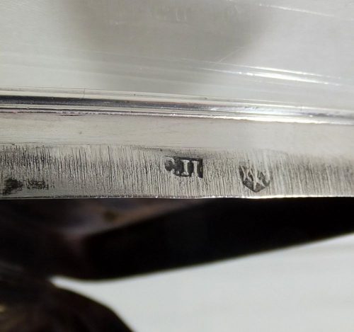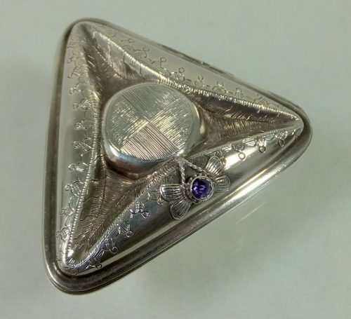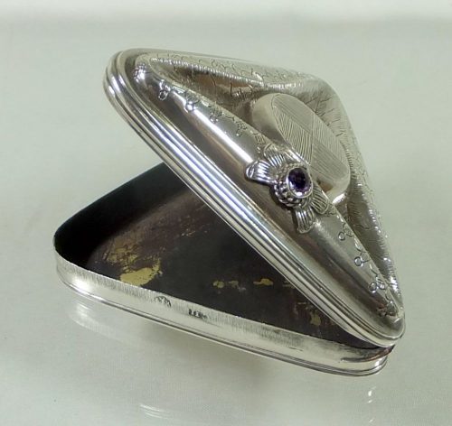 Silver snuff box, marked on the rim with Makers mark and onother / i am not sure wht it is, probably Italian ca 1770 / The box is in the shape of a Bishop’s hat with a small amethyst .