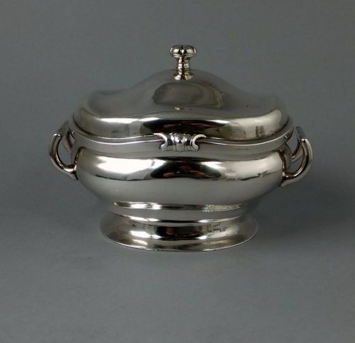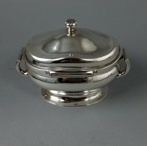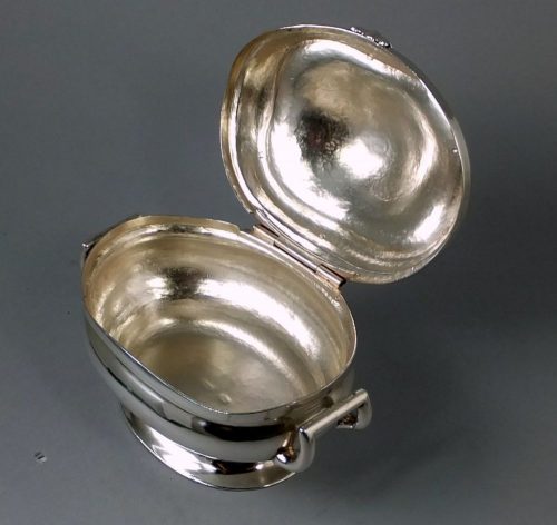 Ca 1780 silver sugarbox or small toureen with two handles. The box is hinged. Marked on the underside with 14.2.2 in a rectangle punch and the makers mark of Sebald Heinrich Blau 1775-1788