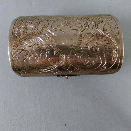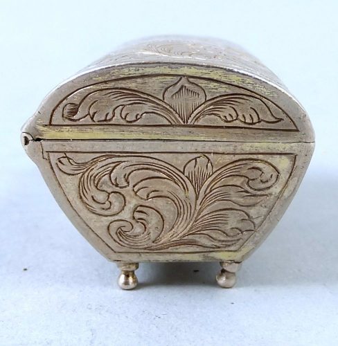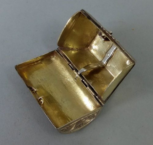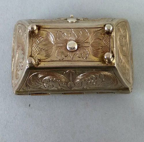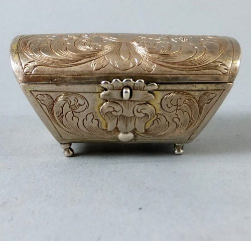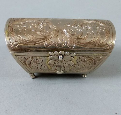 Engraved small silver casket, unmarked probably German ca 1660-80. The domed lid is engraved with a heart pierced with an arrow, which suggests the casket was a marriage gift. The casket was gilt but most of the gilding has worned off, except for the inside where it is in faded but good condition.