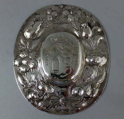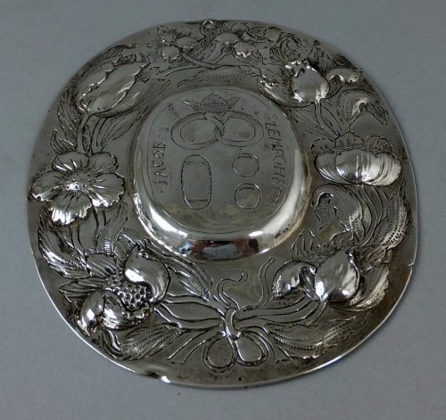 Embossed and engraved silver shield. The engraved bread , precl and buns suggest that this shield was part of the Bakers Gild Cup. These shields were given to the gild by the new master baker , with his name engraved on it to commemorate his acceptance into the gild as a new member. Most probably German ca 1650 -60 with the engraved name ” Jacob Lemfohrdt ”