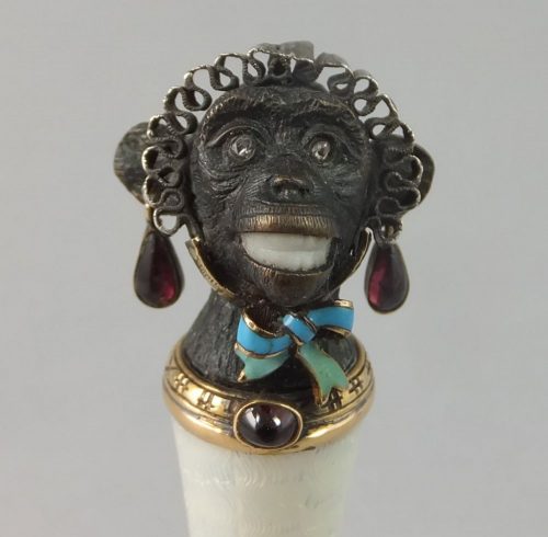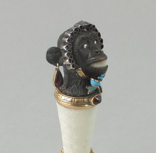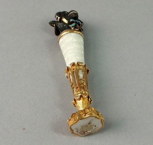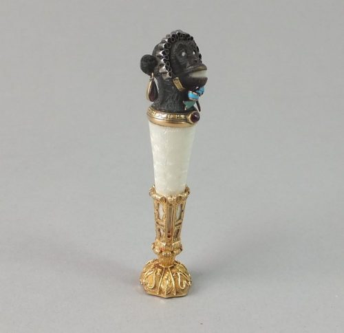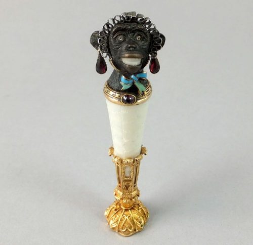 Antique probably English ca 1840 gold desk seal, with a cut white agate armorial seal. The top half is guilloche engraved and enamelled.The top of the seal is with a modelled bronz monkey’s head, wearing gold and garnet earrings. The white teeth are white agate .