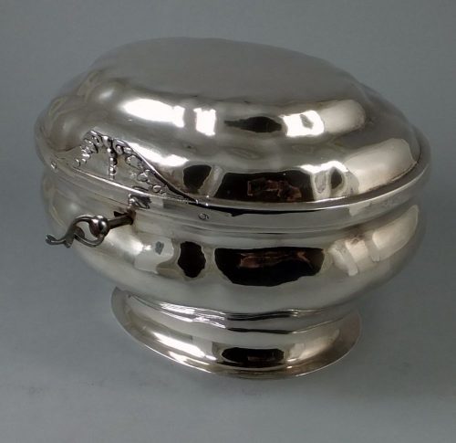 Large silver toilet box with its original lock and key. Marked on lid and underneth with the town mark of Augsburg for 1759-61 the makers mark of Christopher Drentwett who became a registerd Master in 1754 and died in 1801