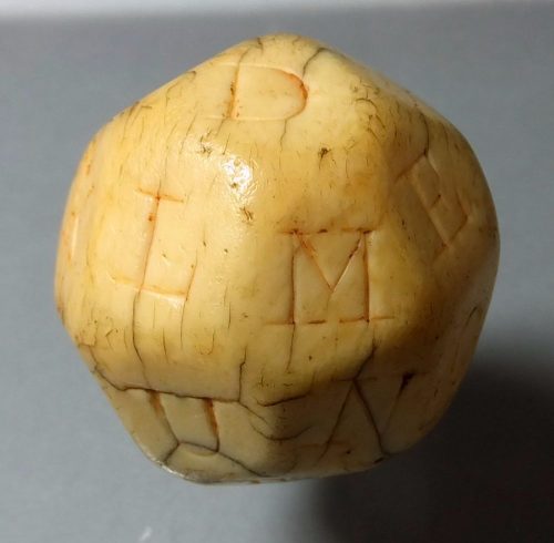 Ca 1700 English gambling dice with thirty two fazetts, each fazett is engraved with a letter. The English philosopher John Locke mentions a thirty two sided ivory ball in “Some Thoughts Concerning Education” /1693/ he writes concerning to teach children to read…”what if an ivory ball were made like the royal oak lottery, with 32 sides …./ reference to the state lottery by Charles the I /