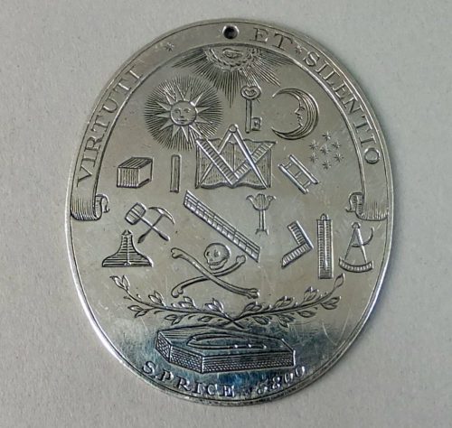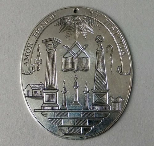 Late eighteenth century engraved silver Masonic badge engraved on both sides with symbols.