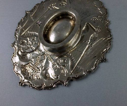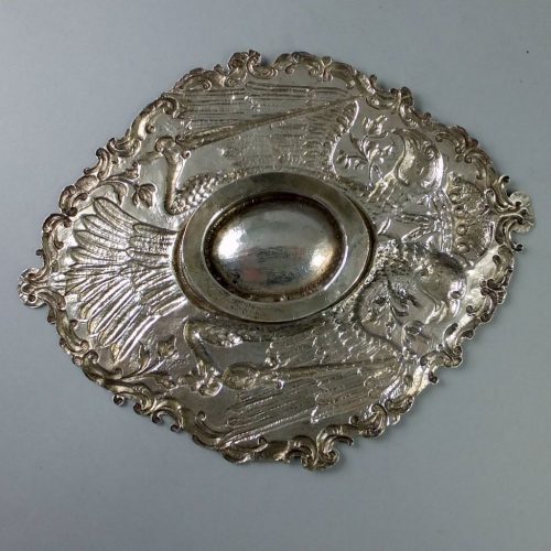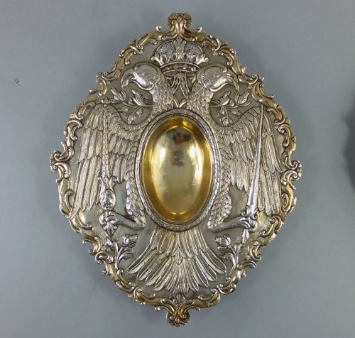 Pair of unmarked partially gilt silver dishes embossed with the Byzantine Eagle. Probably Greek ca 1730-40.