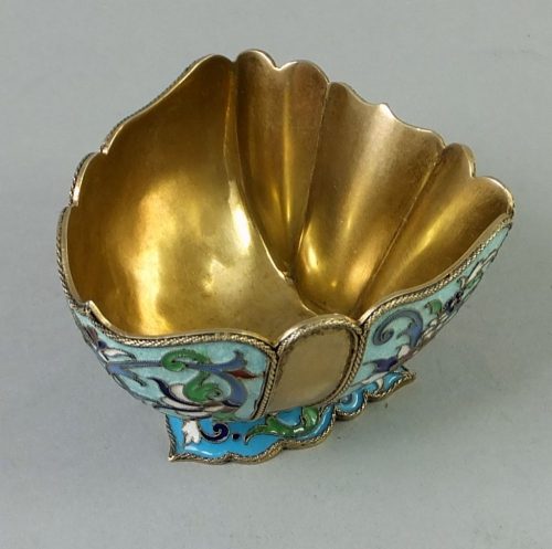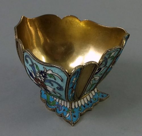 Late nineteeth century cloisonne enamelled silver bowl. The triangular shaped bowl is on a cast and enamelled spread foot. Marked underneath with a “Cocoshnik” mark identified for Moscow 1899-1908 and makers mark of Andreev Vasiliy Ivanovits