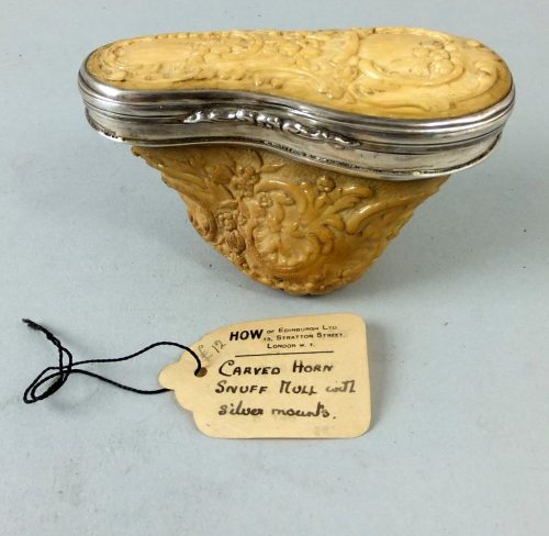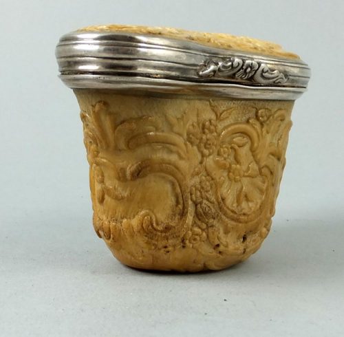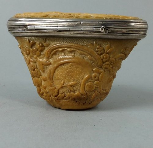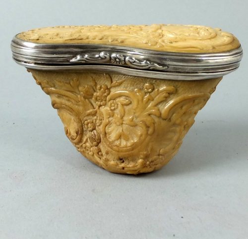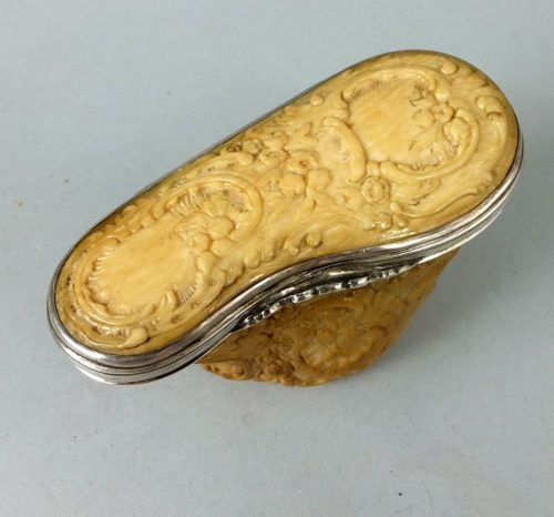 Ca 1740 silver mounted marine ivory and ivory snuff mull. The rococo carved base is walrus and the lid is ivory. The box was sold in the 1950-es by the legendary Mrs How of Edinburgh.