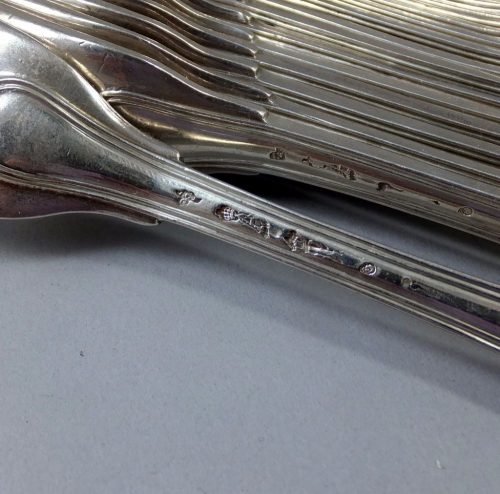 Straight set of eighteen silver forks and spoons, all marked same Paris hallmarks and same maker and same date letter.