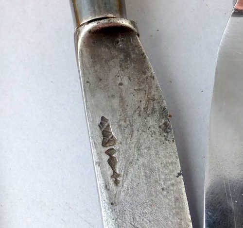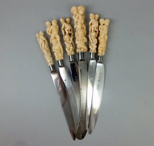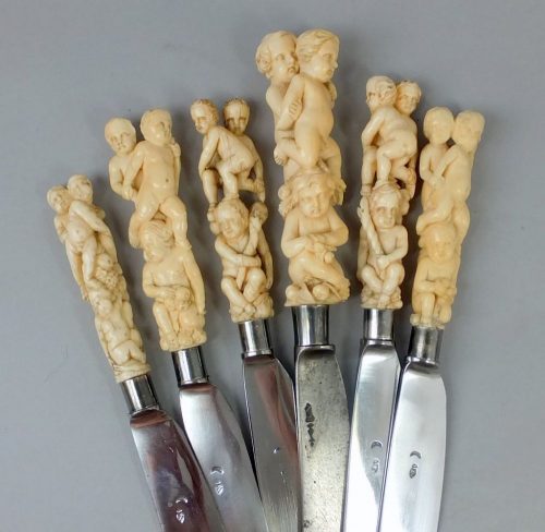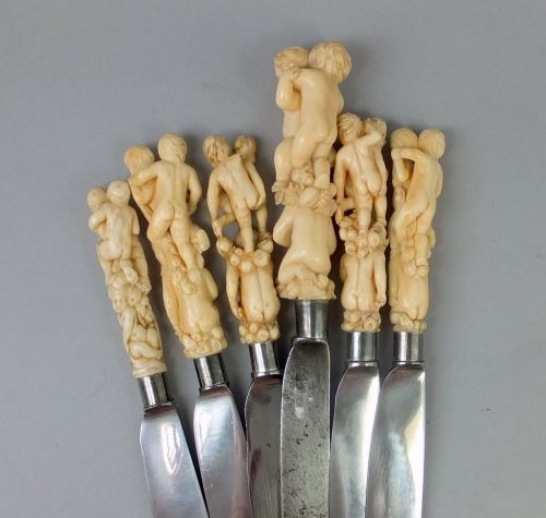 Set of six carved ivory handled knives. German ca 1680. One is bigger than the other five …