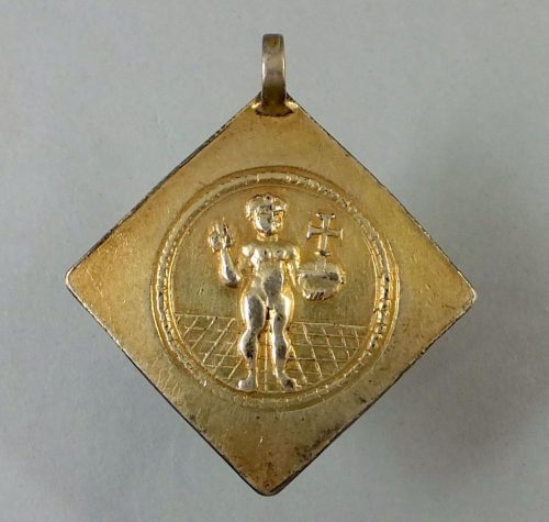 Fire gilt silver christening pendant/medal or perhaps a pilgrims badge. German ca 1660. The counter loop is sovdered on so as to ba able to put a chain through.
