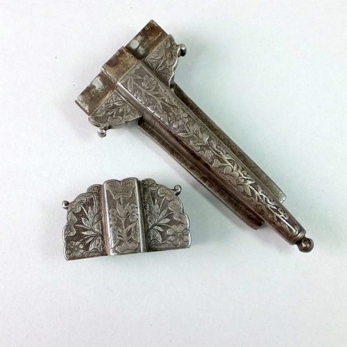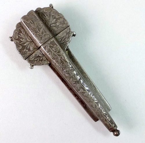 Late seventeenth century engraved scissors case with a separate compartment for a sharpening stone.The sides of the case are with four loops to accomodate a silk string to help wearing it ao a belt.
