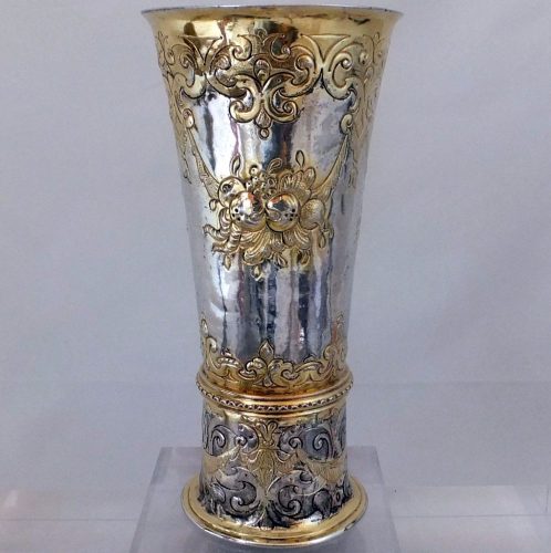 Tall ca 1660 chased and partially gilt beaker. Hungarian from Transylvania.