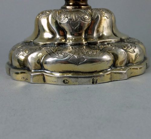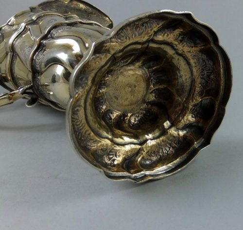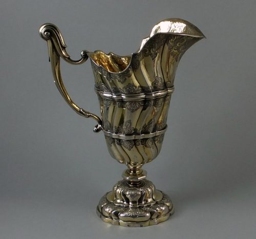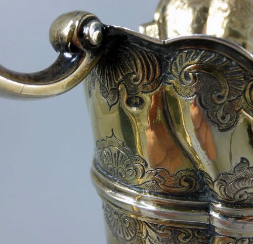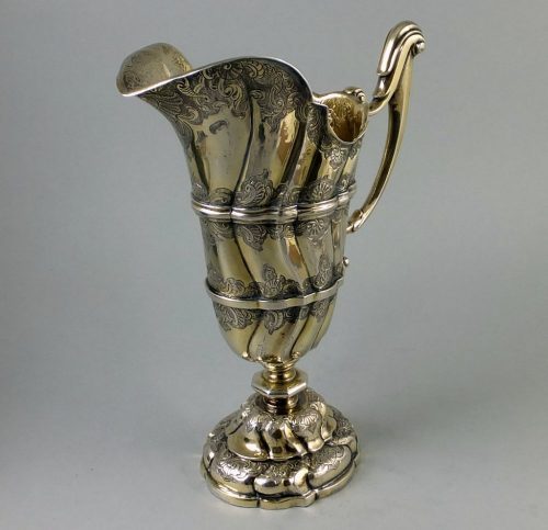 Helmet shaped silver gilt ewer with cast handle and decorated with rocaille flat chasing. Marked on the foot and main body with the town mark of Augsburg for 1743-1745 and the makers mark of Friderich Schwestermuller Master in 1713