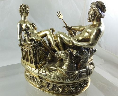 The Cellini Salt Cellar (in Vienna called the Saliera – Italian for salt cellar) is a part-enameled gold table sculpture by Benvenuto Cellini. It was completed in 1543 for Francis I of France, from models that had been prepared many years earlier for Cardinal Ippolito d’Este. The Cellini Salt Cellar depicts a male figure representing the sea and a female figure that represents the earth. A small vessel meant to hold salt is placed next to the male figure.