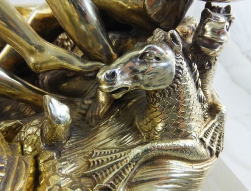 The Saliera is the only work of gold which can be attributed to Cellini with certainty and is sometimes referred to as the “Mona Lisa of Sculpture.” It was created in the style of the late Renaissance and allegorically portrays Terra e Mare in Cellini’s description in his Autobiography, allegorised as Neptune, god of the sea, and Ceres, goddess of the earth, symbolizing their unity in producing salt mined from the earth.