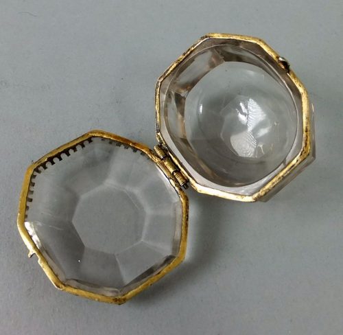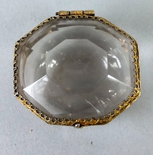 Ca 1600 probaby Italian silver gilt mounted rock crystal reliquary. These reliquaries were carried in the pocket as a healing talisman.