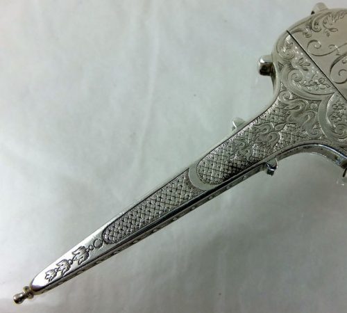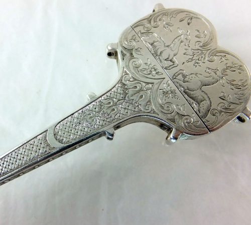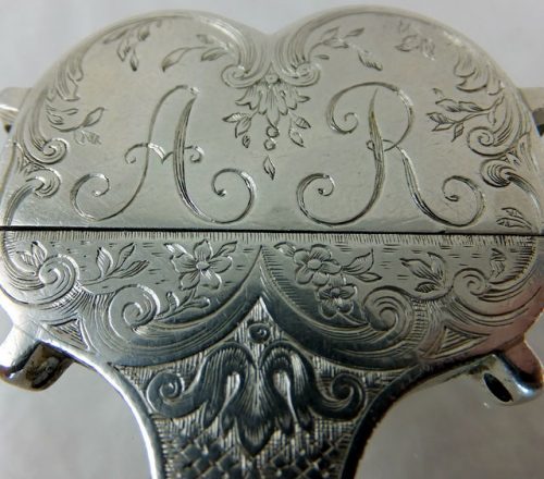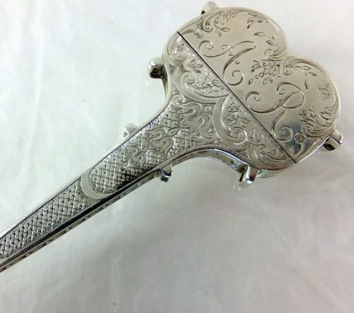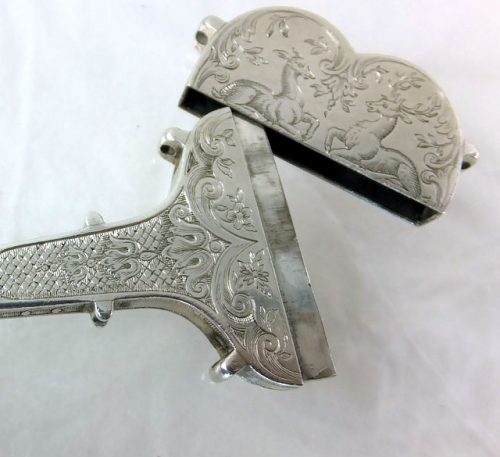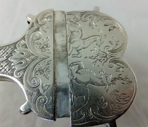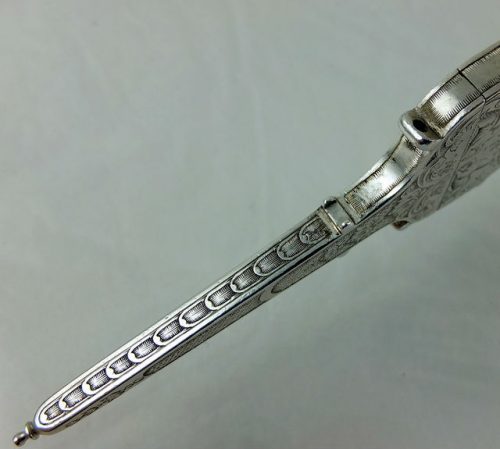 Silver scissors case ca 1710-20. Dutch or English. In the late seventeenth century 500 000 French Protestants left France fleeing religious persecution. Many of them settled in England and Holland. These Huguenots brought with them a wealth of talent and some of the best silversmith at the time came from Huguenots background. These small items of silver ware with exquisite engraving were typical Huguenot work.