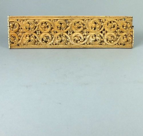 Beautifully carved ivory panel probably was part of a casket. Carved in Sry Lanka in the Portuguese colonial period. The motif is European but the interpretation is Sry Lankan ca 1580. Made for the local Portuguese and could have been part of a casket or cabinet. Amongst Portugals East Indian Empire Ceylon or Sry Lanka in the period of 1550-1650 produced the finest quality ivory carvings.