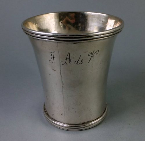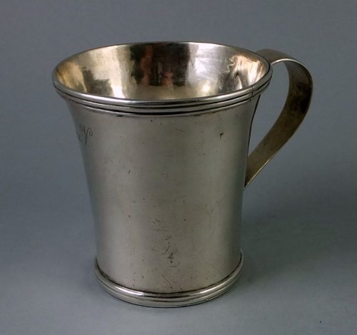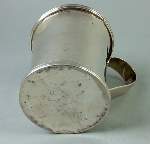 South American silver mug, unmarked ca 1780-1800 , probably Peruvian Spanish Colonial period. Original engraved monograms.