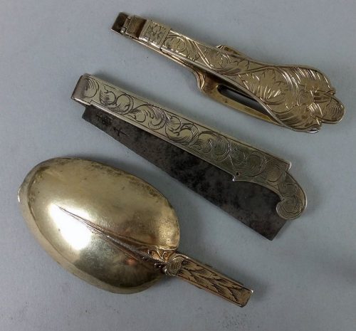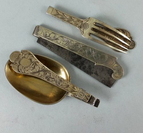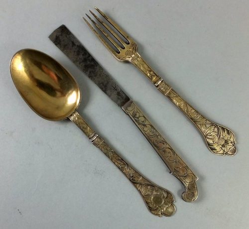Folding knife, a folding spoon, and a folding fork with gilt and engraved silver. The set would normally come in a case unfortunately in this instance the case in missing. Importantly the blade of the knife has not been cut down or reshaped. The blade is with a cutlers mark. Probably German ca 1690