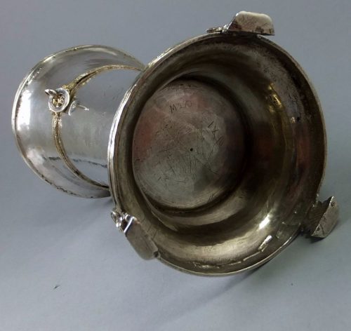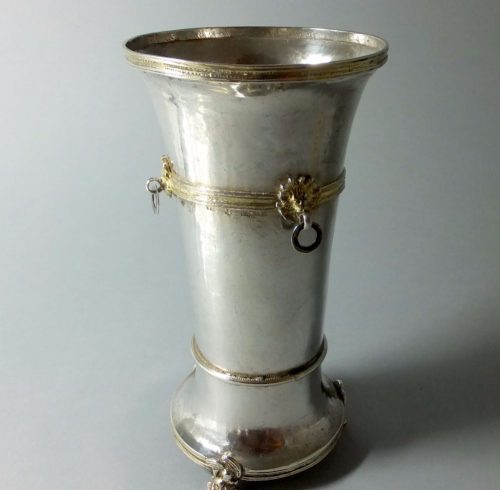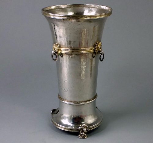 Ca 1600 partially gilt silver beaker on cast feet, with an applied strap around the waist of the beaker. The reeded strap is with three cast lions masks with rings. The cast feet are in the shape of winged cherubs. Un,arked.