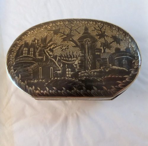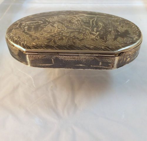 Antique Russian silver snuff box with niello decoration. Gilt inside and on the outside. Fully hallmarked inside with Moscow town mark and date 1806
