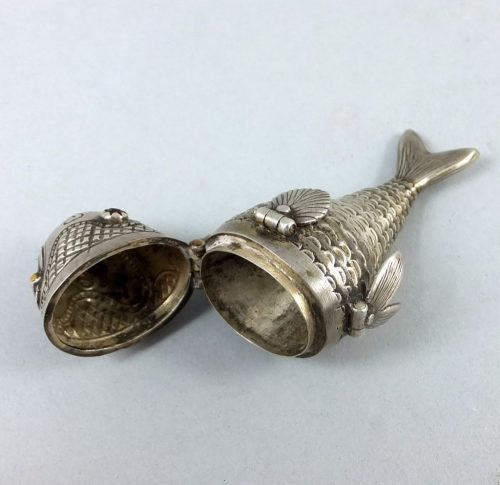 Articulated silver fish box with red glass eyes. Probably German ca 1800.