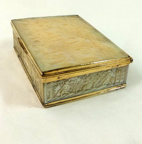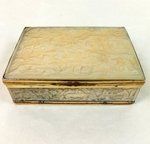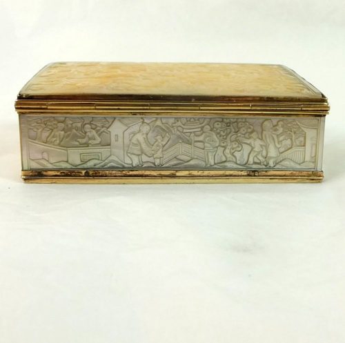 Ca 1800 Chinese gold mounted carved mother of pearl snuff box. All the panels are intriquatly carved with figures and the underside is engraved with flowers