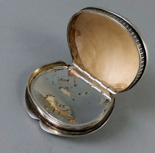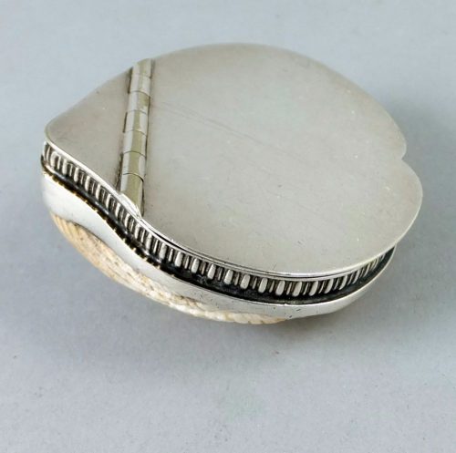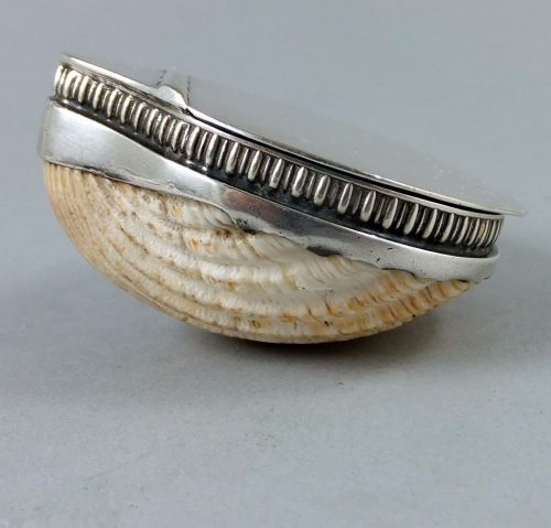 Ca 1770-80 silver mounted shell snuff box with a mirror attached on the inside of the lid.Unmarked probably english.