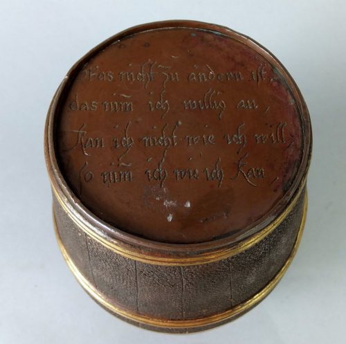 Because of the peculiar geological properties of the region, the local water had a high concentration of copper sulphate. Iron scraps were placed in hollows where the water collected and reacted with the copper sulphate to precipitate copper out of solution. The copper either settled as a sludge or formed a crust over the surface of the iron. This gave rise to the legend that the water had mysterious, if not magical, properties. Such cups are often engraved with rhymes or adorned with small models of miners at work. These puzzle cups were popular throughout Europe from around 1500 to the middle of the 18th century, after which time popular knowledge of chemistry increased and this type of object inevitably became less attractive.