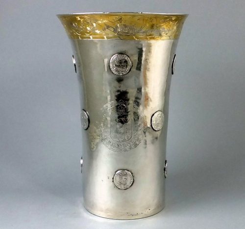 Tall Hungarian ca 1640 silver beaker with coins with engraved armorial and engraved and gilt rim.