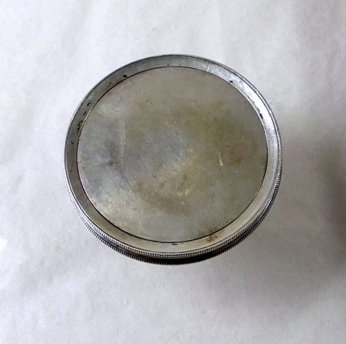 “large” circular engine turned silver pomander, ca 1700 unmarked, German with screw off top.