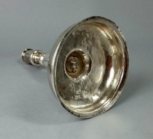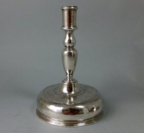 Probably Peru ca 1720 pair of silver candlesticks. The candlesticks are unmarked and one is slightly taller than the other.Cuzco in Peru was the Spanish capital of South America in the eighteenth century and since the silver mines were producing in abundance locally made silver for the use of Spanish Ofiicials and their household was prolific. Probably copied from a 1660 brass candlestick in silver in the very early eighteenth century.