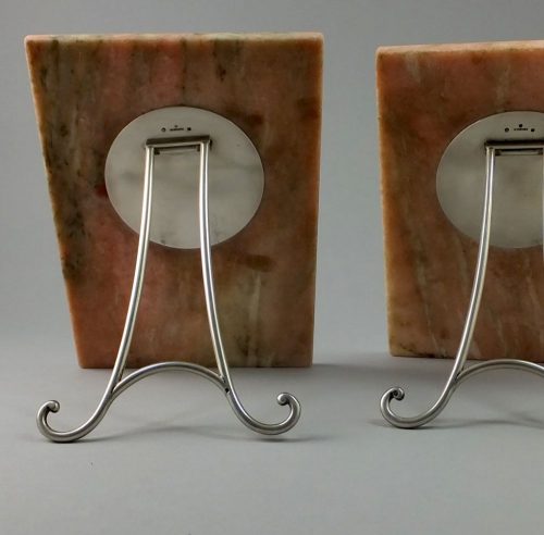 Pair of antique Russian picture frames. The silver frames ar frmed by a pink hardstone, form of rhodonite or marble. The silver is hallmarked with Moscow Marks and the makers mark of Gratchev, who was one of the silversmiths appointed by the Tsar’s Court.