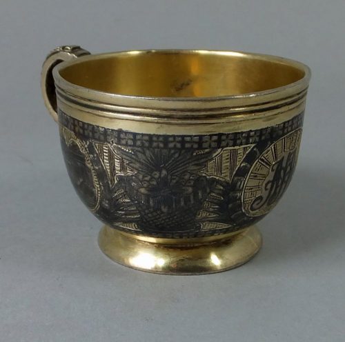 Very good quality Russian silver gilt vodka cup with niello decoration. Marked underneath Moscow 1807. The front of the cup is with a niello monogram of the owner AMA cojoined.