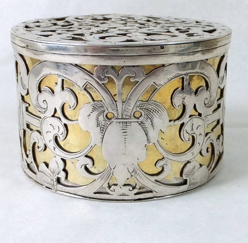 “Large” cilindrical silver cage work box, with the plain “background” box is fire gilt. The cage is with pierced ornaments and flowers.Unmarked , probably Dutch ca 1660. In later fitted box.