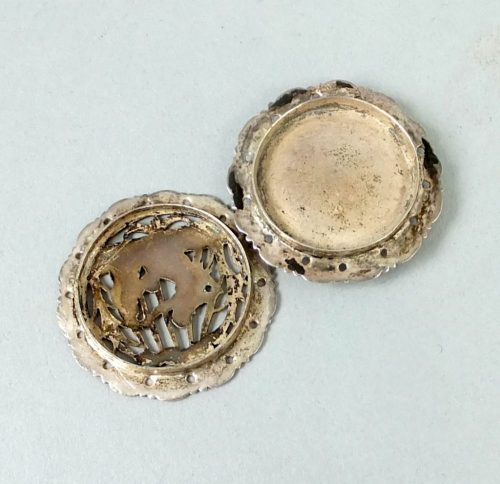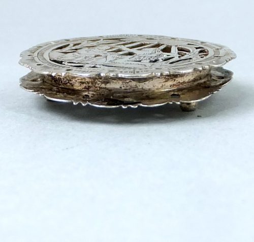 Ca 1700 probably German silver pomander. The pierced and engraved decoration on the detachable lid depicts the baptism of christ. The pomander has three small feet underneath.