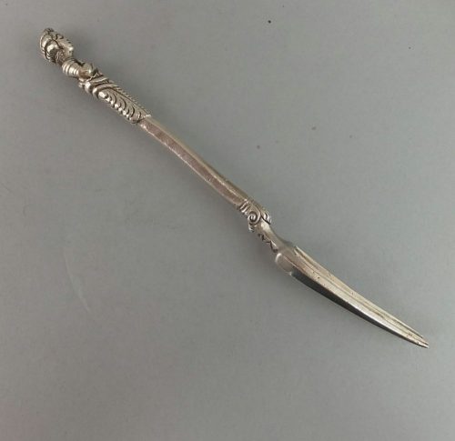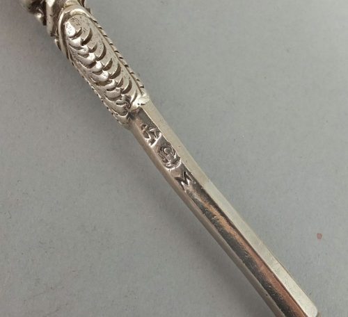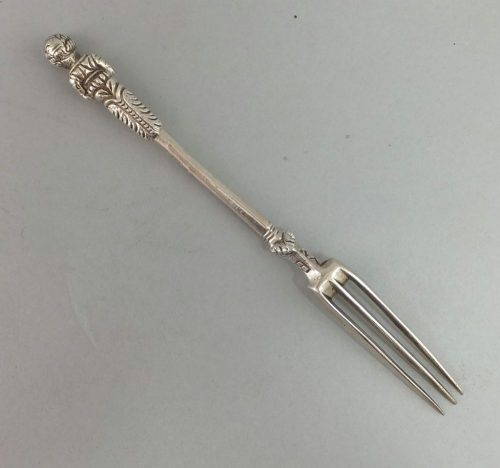 Antique silver fork fully marked with the Town mark of Venice and makers mark. The terminal is with a female figure.